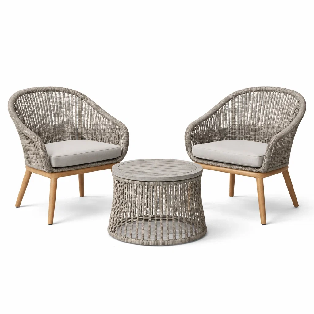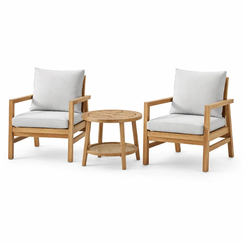 Ensemble de détente en bois avec fauteuils et table basse et coussins gris