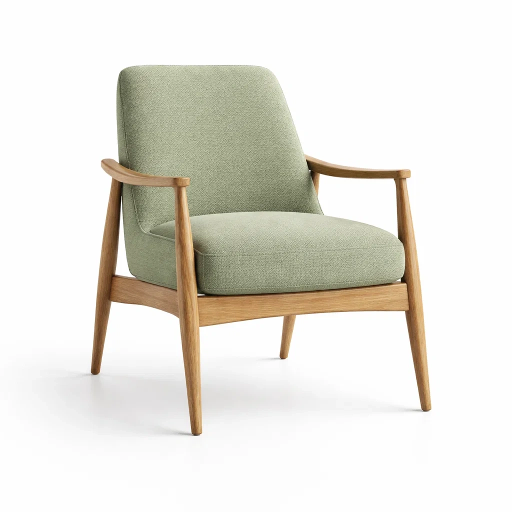 Ce fauteuil dispose d'une structure en chêne massif et d'un revêtement en tissu polyester vert. Le coussin est rembourré de mousse haute densité pour un confort optimal. Les dimensions sont de 80 cm de hauteur, 70 cm de largeur et 75 cm de profondeur.